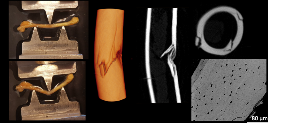 Figure : Essai de flexion en trois points sur un humérus de chauve-souris. CT-scan de ce même humerus permettant de visualiser les fractures en 3D après test, coupes virtuelles longitudinales et transversales autour des fractures. Image MEB d’un humérus montrant la structure osseuse et les cellules de l’os