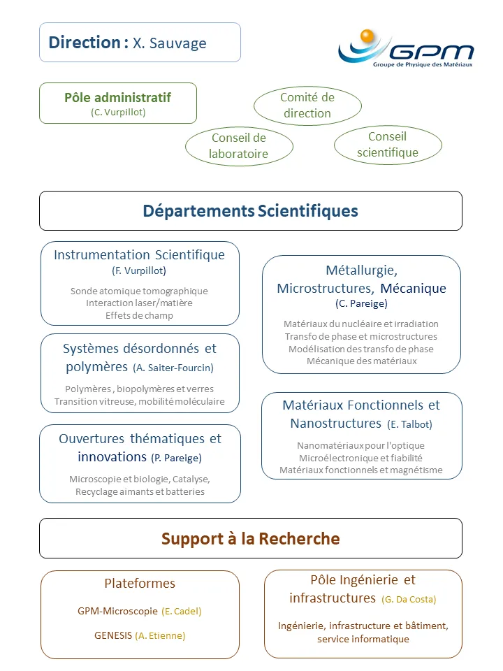 L'environnement régional : Le GPM est un des laboratoires fondateurs de l’Institut CARNOT ESP (Energie et Systèmes de Propulsion) en raison de ses recherches partenariales sur les verrous technologiques des matériaux liés à l’Energie (Production, Transfert, Stockage) et le Transport (Automobile, Aéronautique, Aérospatial). Il est aussi membre du Pôle de Compétitivité MOVEO, de la filière « Normandie AéroEspace (NAE) » et de la filière Normande « Energies ». Le GPM est également membre fondateur du Laboratoire d’Excellence EMC3 (Centre des Matériaux pour l’Energie et de la Combustion Propre) et est porteur du projet d’Equipement d’Excellence GENESIS (Groupe d’Etudes et de Nanoanalyses des Effets d’Irradiations) pour l’étude de matières radioactives. Le GPM est un laboratoire de la fédération CNRS IRMA (Institut de Recherche sur les Matériaux à Propriétés Avancées, en association avec le CIMAP et le CRISMAT), qui est elle-même membre du réseau National de Microscopies (METSA). Il est également membre du Centre de Compétences C’Nano Nord Ouest, et du Réseau d’Intérêt Normand « Energie et Matériaux ».